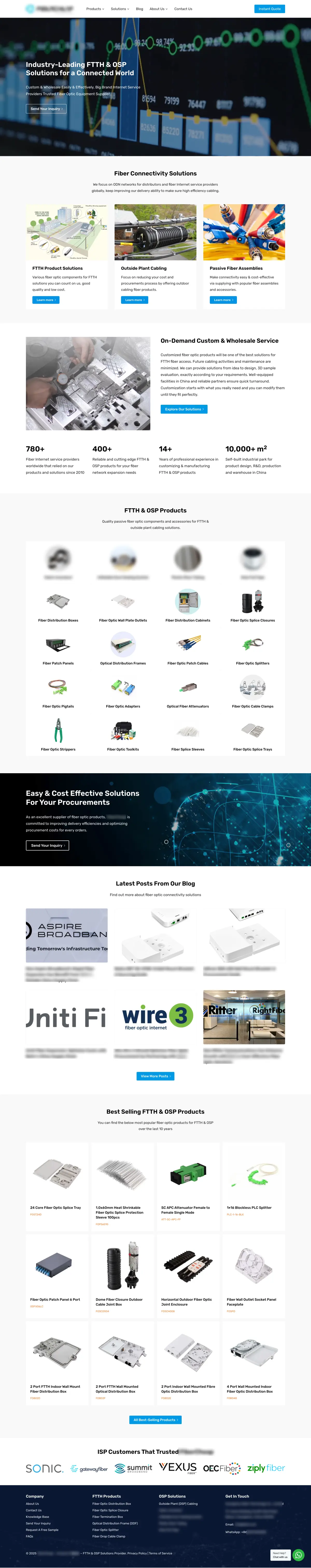 这是我公司团队为珠三角一家外贸公司做的一站式光纤产品B2B外贸独立站,主要客户群体是欧美国家的中小型运营商(ISP)和光纤工程承包商。这个网站提供20多个品类,多达400多个产品SKU,对接7-8家国内光通信行业工厂,为国外中小运营商提供一站式采购的方案和产品定制解决方案。