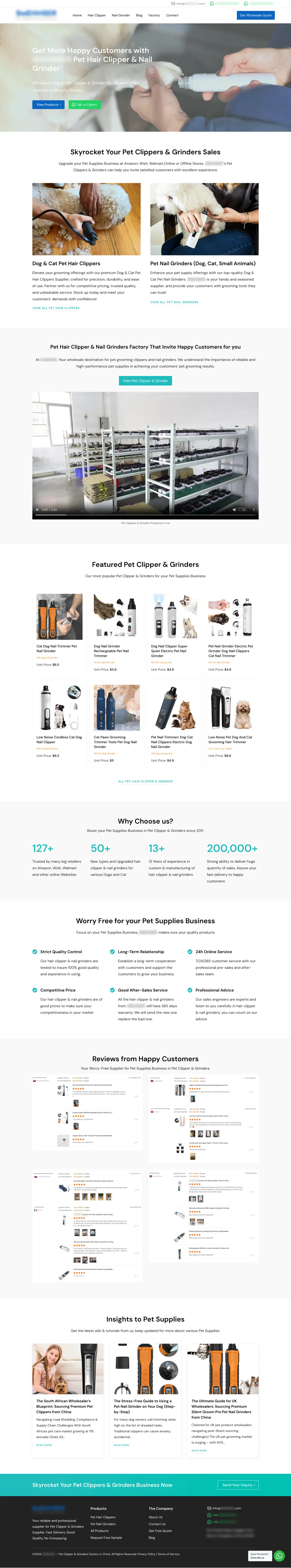 给珠三角某宠物用品外贸公司定制开发的询盘网站,主要产品为电动宠物磨甲器和电动宠物剃发器等。网站上展示了2大品类(磨甲器+剃发器),共计10多款产品,主要目标客户群起是国外的大中小型宠物用品经销商。外贸公司通过网站获得客户,对接工厂,为国外宠物用品经销商提供宠物磨甲器和宠物剃发器产品以及轻定制服务(如Logo定制、颜色款式定制等)。